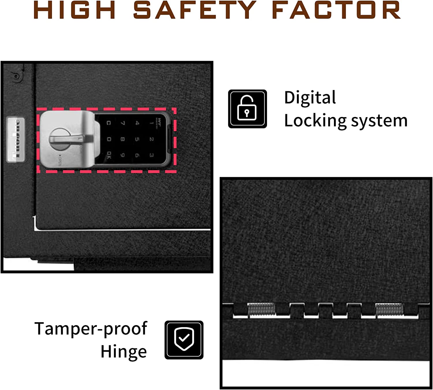 - Tiene un excelente bloqueo de teclado electrónico , fácil de leer, 10.000 combinaciones, difícil de descifrar y más seguro.